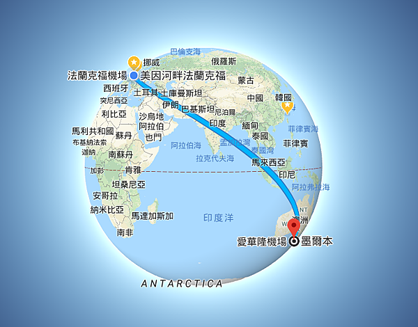 墨爾本到法蘭克福航線目前還沒有直航,加上轉機的總飛行時間至少需要20小時,附上google地圖給大家體會一下這個距離有多遠..